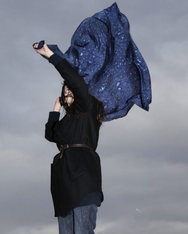 In order to do this, the artist developed her own technique called pluviagraphy – drawing with rain. Using a film coating that is sensitive to water, it becomes possible to create a visual recording of rainfall on a filmed piece of textile. Whether it’s a soft drizzle or a tropical downpour, the type of rain creates a unique print.