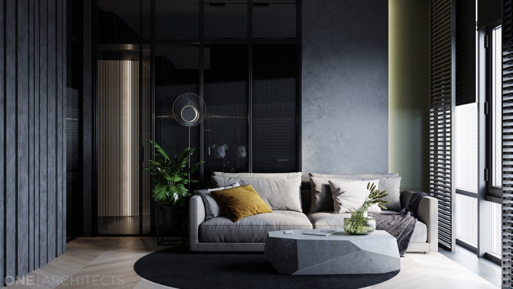 A pale grey cushiony sofa is given a pop of colour with an ochre accent cushion, which stands out brightly inside the shadowy room palette.