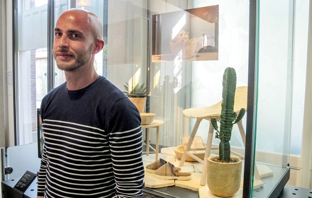 Italian designer Maurizio Montalti poses for a picture in front of everyday objects he created, a chair, vases and even slippers, based on mycelium, the white and film-forming part of mushrooms, at the Micropia Museum displaying the invisible world of micro-organisms in Amsterdam on May 2, 2017.