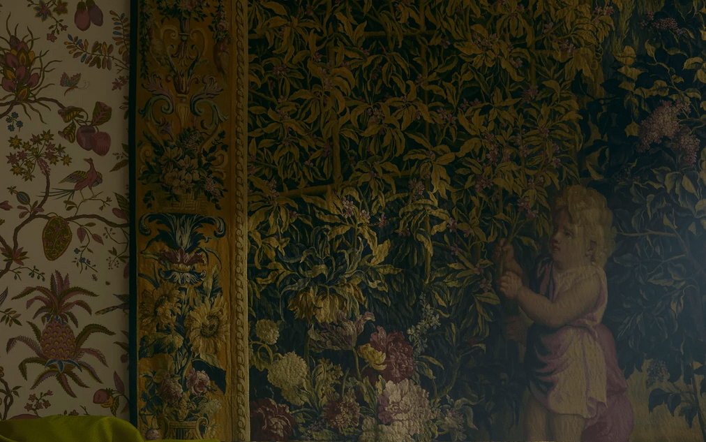 Meanwhile, French heritage label Braquenié, which Pierre Frey acquired in 1991, celebrates its 200th anniversary with the Anniversaire 1823–2023 collection, featuring more than 50 fabrics, 30 wallpapers, and 10 rugs that draw on the textile maison’s archival documents, as well as those in the heritage collections of the Château de Versailles, the Musée des Arts Décoratifs in Paris, and the Musée de la Toile de Jouy. Featuring several fabrics directly inspired by tapestry, cross-stitching, and other highly textural woven techniques, the collection launched during Paris Déco Off and made for one of the week’s most memorable events: At Château de Louye, a privately owned castle in Normandy, Braquenié fabrics dressed nearly every interior in marvelously patterned layers for a sumptuous display of French heritage, expertly blending the old and the new.