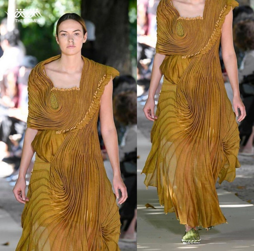 “Her spring/summer 2021 collection that was shot in Italy, saw ropes of khunn and Chanderi imitating branches that covered the silhouettes of deconstructed saris. For her couture foray, the designer feels a sense of freedom and excitement working with her emblematic use of nature on a blend of fabrics including khadi. Expect textured weaves on complex silhouettes as the end result. “I have had a very clear path for the last twenty years; it is a journey I am on—and of which you will see the clear advancement, maybe in a clearer way this time—which is what haute couture allows.”- VOGUE